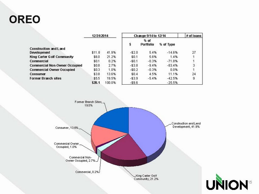 NPAs by Type 14 12/31/2014 Change 9/14 to 12/14 $ % of Portfolio % of Type Construction and Land Development $3.3 7.0% - $2.4 - 2.8% - 41.7% Commercial $5.5 11.6% $2.3 6.1% 73.4% Commercial NonOwner Occupied $5.9 12.4% $5.7 12.2% n/a Commercial Owner Occupied $1.0 2.1% - $0.3 - 0.1% - 22.5% Consumer $3.6 7.6% - $3.4 - 4.4% - 48.4% Other $0.0 0.0% - $3.1 - 5.3% - 100.0% OREO $28.1 59.3% - $9.7 - 5.7% - 25.6% $47.4 100.0% - $10.7 - 18.5% Construction and Land Development , 7.0% Commercial , 11.6% Commercial NonOwner Occupied , 12.4% Commercial Owner Occupied , 2.1% Consumer , 7.6% Other, 0.0% OREO , 59.3%