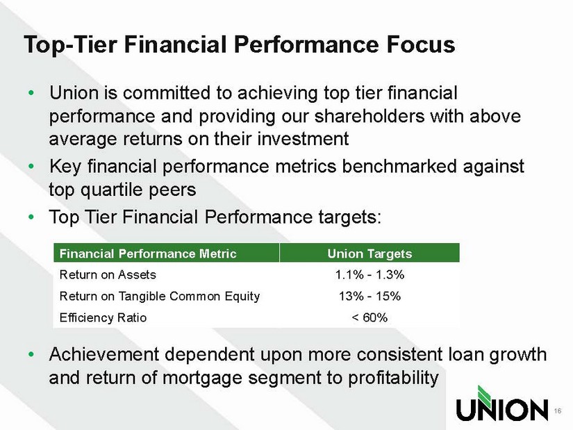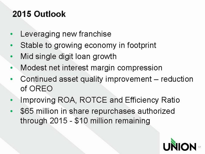 Top - Tier Financial Performance Focus • Union is committed to achieving top tier financial performance and providing our shareholders with above average returns on their investment • Key financial performance metrics benchmarked against top quartile peers • Top Tier Financial Performance targets: • Achievement dependent upon more consistent loan growth and return of mortgage segment to profitability 16 Financial Performance Metric Union Targets Return on Assets 1.1% - 1.3% Return on Tangible Common Equity 13% - 15% Efficiency Ratio < 60%