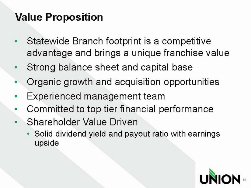 2015 Outlook • Leveraging new franchise • Stable to growing economy in footprint • Mid single digit loan growth • Modest net interest margin compression • Continued asset quality improvement – reduction of OREO • Improving ROA, ROTCE and Efficiency Ratio • $65 million in share repurchases authorized through 2015 - $10 million remaining 17
