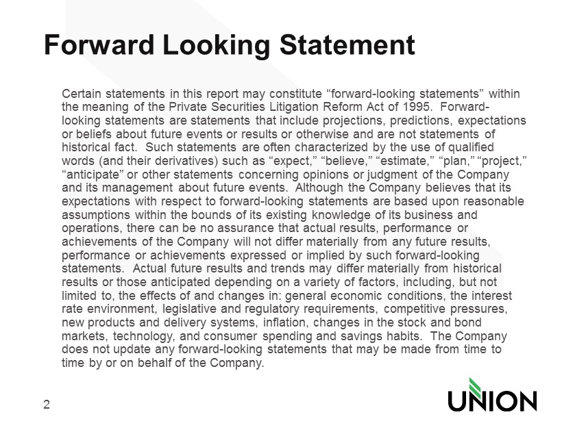2 Forward Looking Statement Certain statements in this report may constitute “forward - looking statements” within the meaning of the Private Securities Litigation Reform Act of 1995. Forward - looking statements are statements that include projections, predictions, expectations or beliefs about future events or results or otherwise and are not statements of historical fact. Such statements are often characterized by the use of qualified words (and their derivatives) such as “expect,” “believe,” “estimate,” “plan,” “project,” “anticipate” or other statements concerning opinions or judgment of the Company and its management about future events. Although the Company believes that its expectations with respect to forward - looking statements are based upon reasonable assumptions within the bounds of its existing knowledge of its business and operations, there can be no assurance that actual results, performance or achievements of the Company will not differ materially from any future results, performance or achievements expressed or implied by such forward - looking statements. Actual future results and trends may differ materially from historical results or those anticipated depending on a variety of factors, including, but not limited to, the effects of and changes in: general economic conditions, the interest rate environment, legislative and regulatory requirements, competitive pressures, new products and delivery systems, inflation, changes in the stock and bond markets, technology, and consumer spending and savings habits. The Company does not update any forward - looking statements that may be made from time to time by or on behalf of the Company.