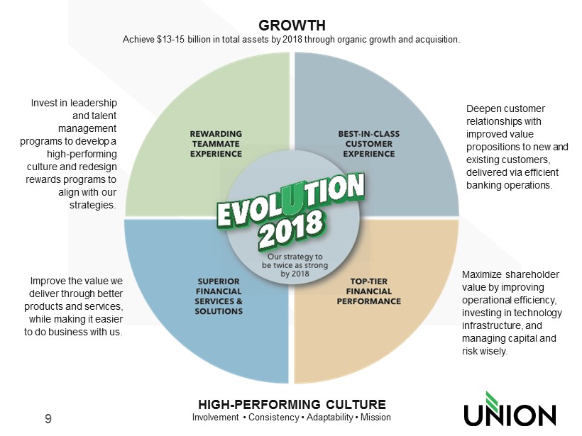 9 Invest in leadership and talent management programs to develop a high - performing culture and redesign rewards programs to align with our strategies. Improve the value we deliver through better products and services, while making it easier to do business with us. Deepen customer relationships with improved value propositions to new and existing customers, delivered via efficient banking operations. Maximize shareholder value by improving operational efficiency, investing in technology infrastructure, and managing capital and risk wisely. GROWTH Achieve $13 - 15 billion in total assets by 2018 through organic growth and acquisition. HIGH - PERFORMING CULTURE Involvement • Consistency • Adaptability • Mission