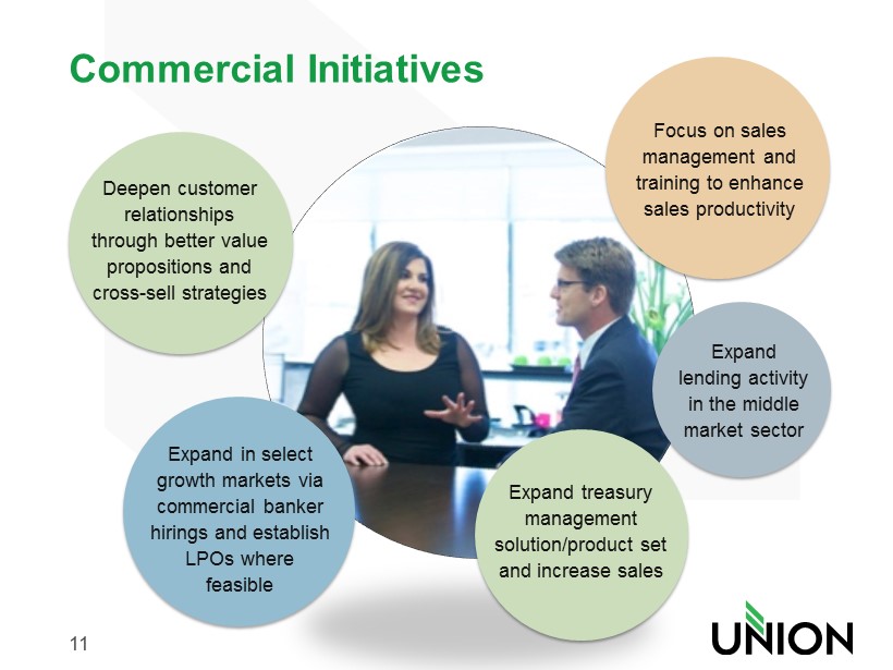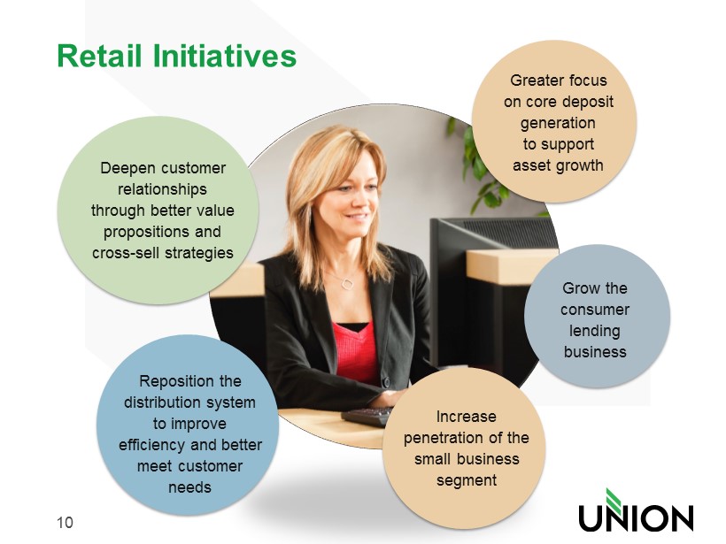 10 Retail Initiatives Deepen customer relationships through better value propositions and cross - sell strategies Greater focus on core deposit generation to support asset growth Grow the consumer lending business Increase penetration of the small business segment Reposition the distribution system to improve efficiency and better meet customer needs