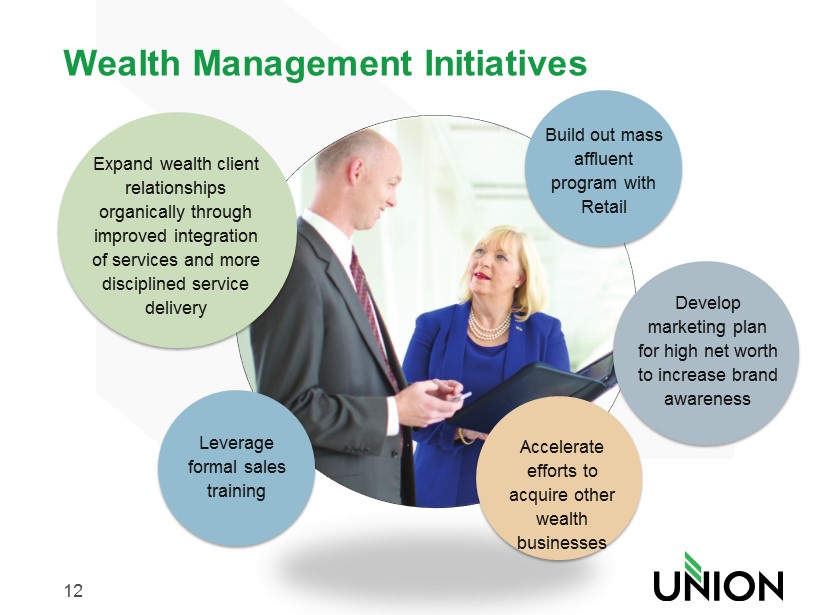 11 Commercial Initiatives Expand lending activity in the middle market sector Expand treasury management solution/product set and increase sales Focus on sales management and training to enhance sales productivity Expand in select growth markets via commercial banker hirings and establish LPOs where feasible Deepen customer relationships through better value propositions and cross - sell strategies