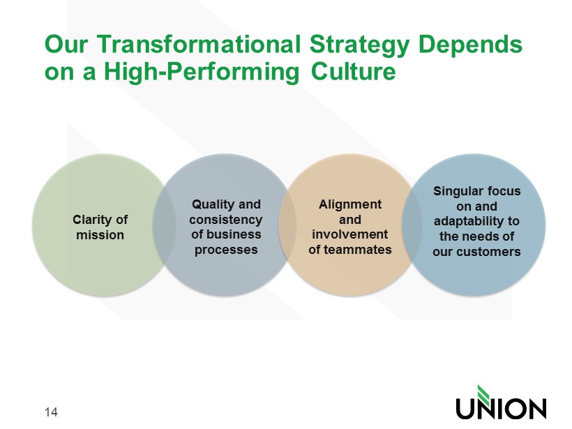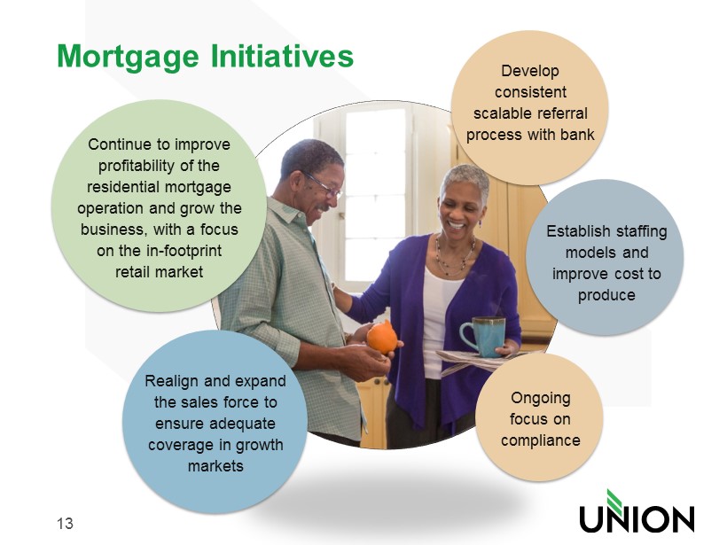 13 Mortgage Initiatives Realign and expand the sales force to ensure adequate coverage in growth markets Continue to improve profitability of the residential mortgage operation and grow the business, with a focus on the in - footprint retail market Ongoing f ocus on compliance Establish staffing models and improve cost to produce Develop consistent scalable referral process with bank