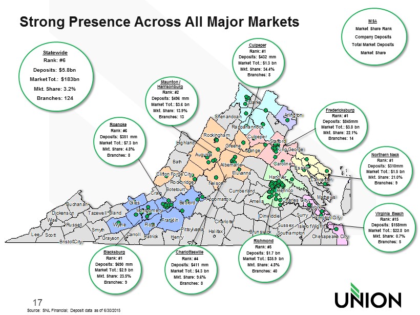 16 Source: SNL Financial; Deposit data as of 6/30/2015; Pro forma for recent acquisitions Largest Community Bank in Virginia Rank Institution (ST) Number of Branches Deposits in Market ($mm) Market Share (%) 1 Wells Fargo & Co. (CA) 290 36,737 20.1 2 Bank of America Corp. (NC) 142 27,609 15.1 3 BB&T Corp. (NC) 358 22,794 12.5 4 SunTrust Banks Inc. (GA) 209 18,786 10.3 5 Capital One Financial Corp. (VA) 80 10,649 5.8 6 Union Bkshs Corp (VA) 124 5,795 3.2 7 TowneBank (VA) 43 5,208 2.8 8 United Bankshares Inc. (WV) 61 4,325 2.4 9 Carter Bank & Trust (VA) 88 3,885 2.1 10 PNC Financial Services Group (PA) 100 3,360 1.8 Totals (1-10) 1,495 139,147 76.0 Totals (1-128) 2,503 183,103 100.0 Deposit Market Share – Virginia