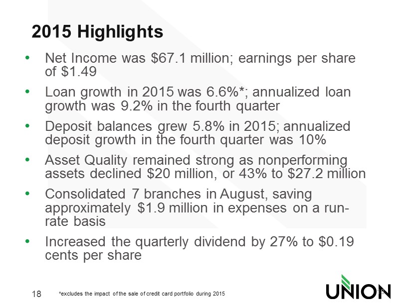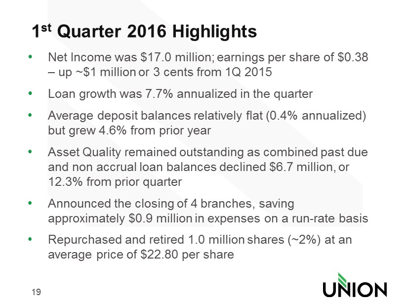 18 2015 Highlights • Net Income was $67.1 million; earnings per share of $1.49 • Loan growth in 2015 was 6.6%*; annualized loan growth was 9.2% in the fourth quarter • Deposit balances grew 5.8% in 2015; annualized deposit growth in the fourth quarter was 10% • Asset Quality remained strong as nonperforming assets declined $20 million, or 43% to $27.2 million • Consolidated 7 branches in August, saving approximately $1.9 million in expenses on a run - rate basis • Increased the quarterly dividend by 27% to $ 0.19 cents per share 18 *excludes the impact of the sale of credit card portfolio during 2015