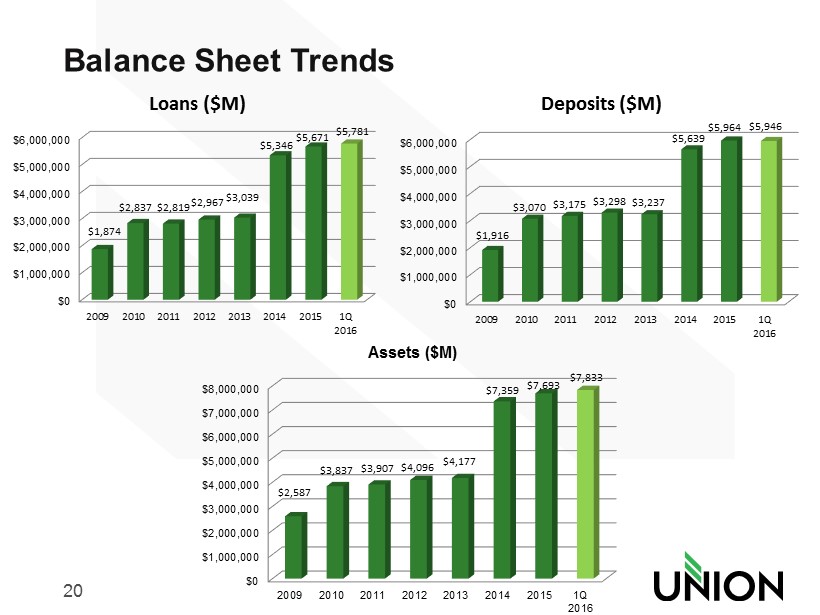 19 1 st Quarter 2016 Highlights • Net Income was $17.0 million; earnings per share of $0.38 – up ~$1 million or 3 cents from 1Q 2015 • Loan growth was 7.7% annualized in the quarter • Average deposit balances relatively flat (0.4% annualized) but grew 4.6% from prior year • Asset Quality remained outstanding as combined past due and non accrual loan balances declined $6.7 million, or 12.3% from prior quarter • Announced the closing of 4 branches, saving approximately $0.9 million in expenses on a run - rate basis • Repurchased and retired 1.0 million shares (~2%) at an average price of $22.80 per share