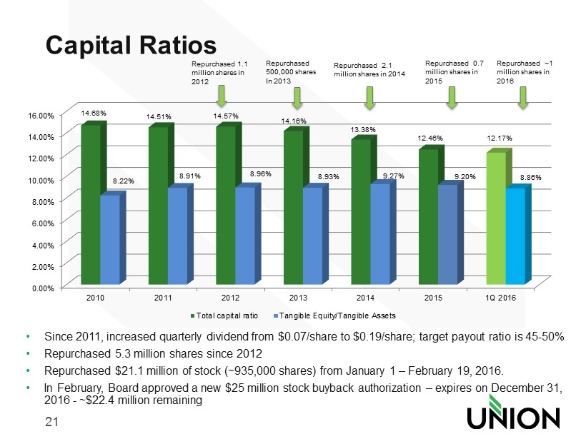 20 Balance Sheet Trends $0 $1,000,000 $2,000,000 $3,000,000 $4,000,000 $5,000,000 $6,000,000 2009 2010 2011 2012 2013 2014 2015 1Q 2016 $1,874 $2,837 $2,819 $2,967 $3,039 $5,346 $5,671 $5,781 Loans ($M) $0 $1,000,000 $2,000,000 $3,000,000 $4,000,000 $5,000,000 $6,000,000 2009 2010 2011 2012 2013 2014 2015 1Q 2016 $1,916 $3,070 $3,175 $3,298 $3,237 $5,639 $5,964 $5,946 Deposits ($M) $0 $1,000,000 $2,000,000 $3,000,000 $4,000,000 $5,000,000 $6,000,000 $7,000,000 $8,000,000 2009 2010 2011 2012 2013 2014 2015 1Q 2016 $2,587 $3,837 $3,907 $4,096 $4,177 $7,359 $7,693 $7,833 Assets ($M)