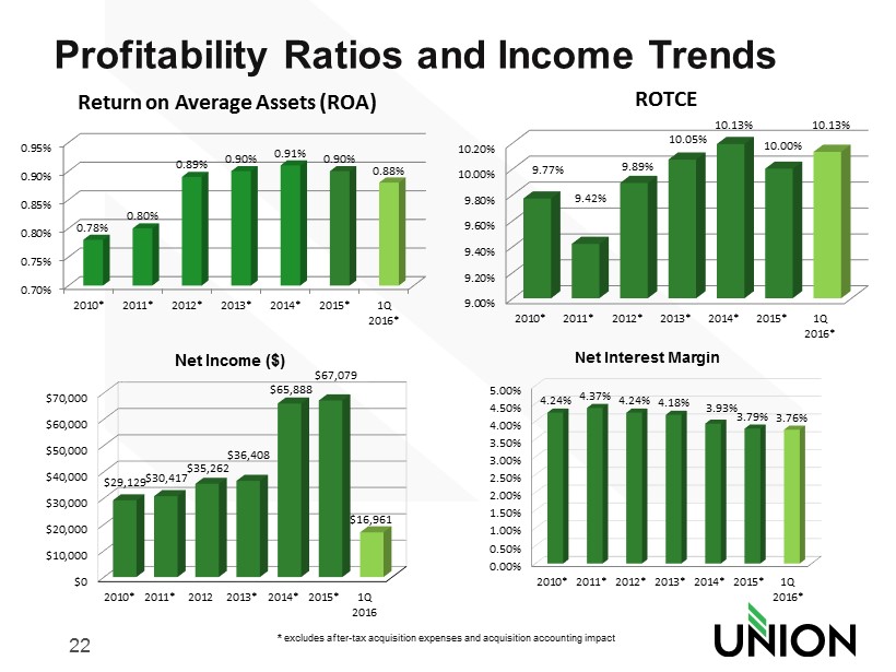 21 0.00% 2.00% 4.00% 6.00% 8.00% 10.00% 12.00% 14.00% 16.00% 2010 2011 2012 2013 2014 2015 1Q 2016 14.68% 14.51% 14.57% 14.16% 13.38% 12.46% 12.17% 8.22% 8.91% 8.96% 8.93% 9.27% 9.20% 8.86% Total capital ratio Tangible Equity/Tangible Assets Repurchased 1.1 million shares in 2012 Capital Ratios • Since 2011, increased quarterly dividend from $0.07/share to $ 0.19/share; target payout ratio is 45 - 50% • Repurchased 5.3 million shares since 2012 • Repurchased $21.1 million of stock (~935,000 shares) from January 1 – February 19, 2016. • In February, Board approved a new $25 million stock buyback authorization – expires on December 31, 2016 - ~$22.4 million remaining Repurchased 500,000 shares In 2013 Repurchased 2.1 million shares in 2014 Repurchased 0.7 million shares in 2015 Repurchased ~1 million shares in 2016