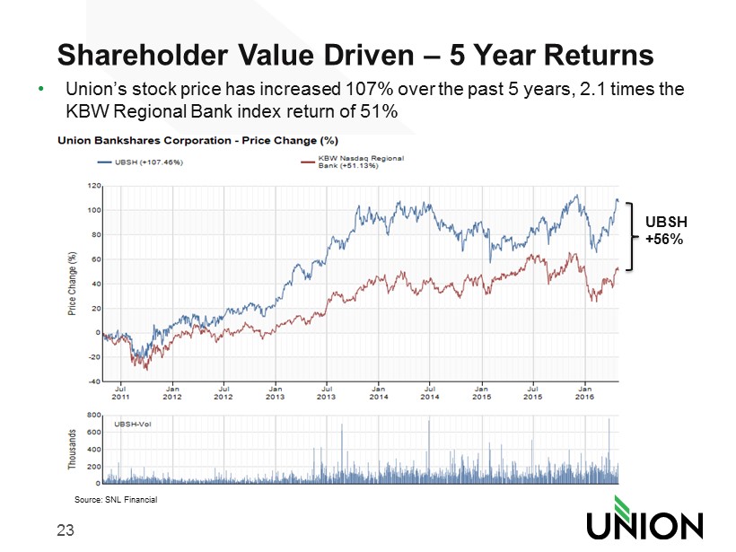 22 Profitability Ratios and Income Trends * excludes after - tax acquisition expenses and acquisition accounting impact 0.70% 0.75% 0.80% 0.85% 0.90% 0.95% 2010* 2011* 2012* 2013* 2014* 2015* 1Q 2016* 0.78% 0.80% 0.89% 0.90% 0.91% 0.90% 0.88% Return on Average Assets (ROA) 9.00% 9.20% 9.40% 9.60% 9.80% 10.00% 10.20% 2010* 2011* 2012* 2013* 2014* 2015* 1Q 2016* 9.77% 9.42% 9.89% 10.05% 10.13% 10.00% 10.13% ROTCE $0 $10,000 $20,000 $30,000 $40,000 $50,000 $60,000 $70,000 2010* 2011* 2012 2013* 2014* 2015* 1Q 2016 $29,129 $ 30,417 $ 35,262 $ 36,408 $65,888 $67,079 $16,961 Net Income ($) 0.00% 0.50% 1.00% 1.50% 2.00% 2.50% 3.00% 3.50% 4.00% 4.50% 5.00% 2010* 2011* 2012* 2013* 2014* 2015* 1Q 2016* 4.24% 4.37% 4.24% 4.18% 3.93% 3.79% 3.76% Net Interest Margin