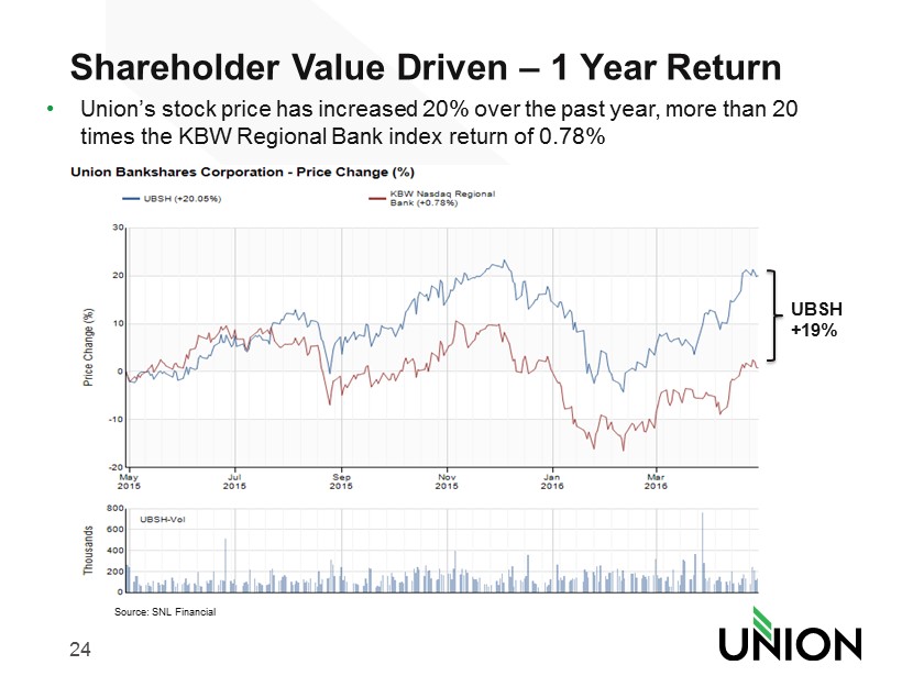 23 Shareholder Value Driven – 5 Year Returns • Union’s stock price has increased 107% over the past 5 years, 2.1 times the KBW Regional Bank index return of 51% Source: SNL Financial UBSH +56%