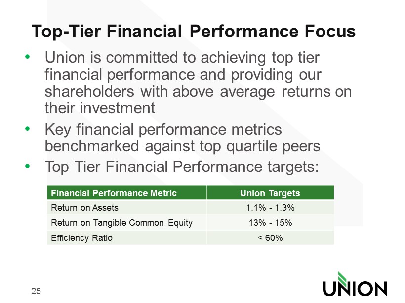 24 Shareholder Value Driven – 1 Year Return • Union’s stock price has increased 20% over the past year, more than 2 0 times the KBW Regional Bank index return of 0.78% Source: SNL Financial UBSH +19%