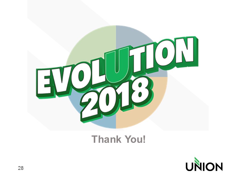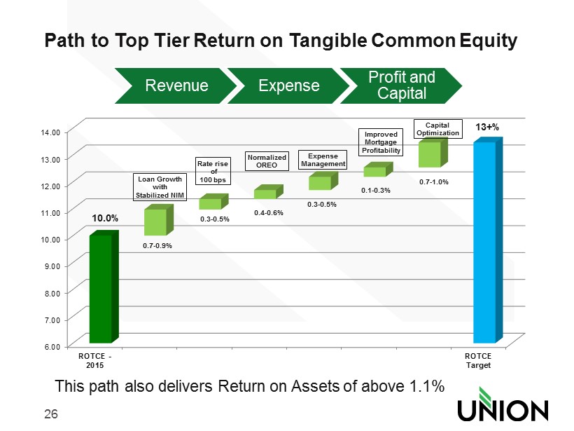 25 Top - Tier Financial Performance Focus • Union is committed to achieving top tier financial performance and providing our shareholders with above average returns on their investment • Key financial performance metrics benchmarked against top quartile peers • Top Tier Financial Performance targets: Financial Performance Metric Union Targets Return on Assets 1.1% - 1.3% Return on Tangible Common Equity 13% - 15% Efficiency Ratio < 60%