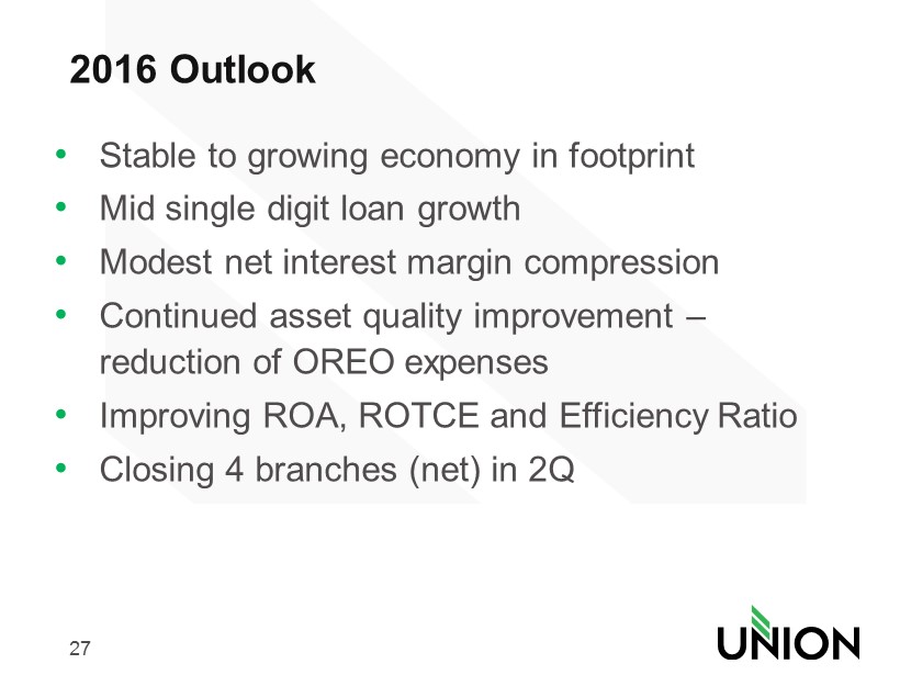 26 Path to Top Tier Return on Tangible Common Equity 6.00 7.00 8.00 9.00 10.00 11.00 12.00 13.00 14.00 ROTCE - 2015 ROTCE Target 0.7 - 0.9% 0.3 - 0.5% 0.4 - 0.6% 0.3 - 0.5% 0.1 - 0.3% 0.7 - 1.0% 13+% 10.0% Loan Growth with Stabilized NIM Rate rise of 100 bps Normalized OREO Expense Management Improved Mortgage Profitability Capital Optimization Revenue Expense Profit and Capital This path also delivers Return on Assets of above 1.1%