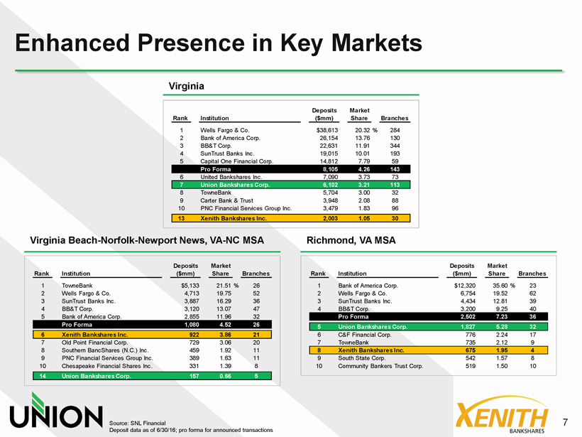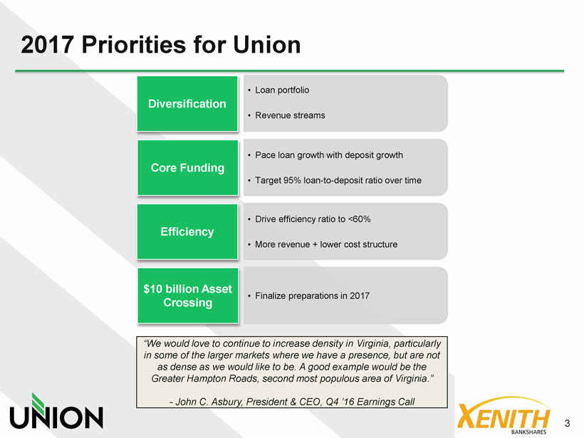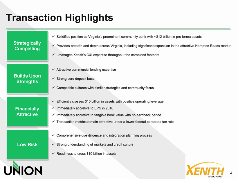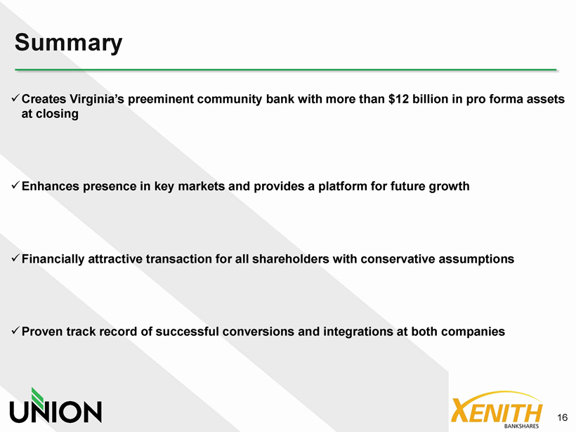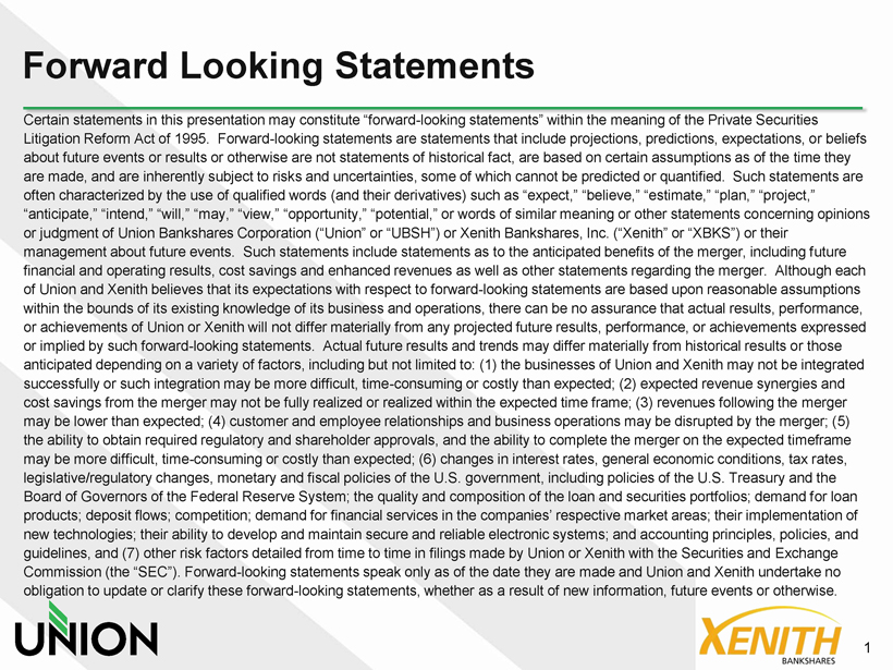 1 Forward Looking Statements Certain statements in this presentation may constitute “forward - looking statements” within the meaning of the Private Securities Litigation Reform Act of 1995. Forward - looking statements are statements that include projections, predictions, expectations, o r beliefs about future events or results or otherwise are not statements of historical fact, are based on certain assumptions as of the ti me they are made, and are inherently subject to risks and uncertainties, some of which cannot be predicted or quantified. Such state men ts are often characterized by the use of qualified words (and their derivatives) such as “expect,” “believe,” “estimate,” “plan,” “p roj ect,” “anticipate,” “intend,” “will,” “may,” “view,” “opportunity,” “potential,” or words of similar meaning or other statements co nce rning opinions or judgment of Union Bankshares Corporation (“Union” or “UBSH”) or Xenith Bankshares, Inc. (“Xenith” or “XBKS”) or their management about future events. Such statements include statements as to the anticipated benefits of the merger, including f utu re financial and operating results, cost savings and enhanced revenues as well as other statements regarding the merger. Althou gh each of Union and Xenith believes that its expectations with respect to forward - looking statements are based upon reasonable assumpti ons within the bounds of its existing knowledge of its business and operations, there can be no assurance that actual results, pe rfo rmance, or achievements of Union or Xenith will not differ materially from any projected future results, performance, or achievements ex pressed or implied by such forward - looking statements. Actual future results and trends may differ materially from historical results o r those anticipated depending on a variety of factors, including but not limited to: (1) the businesses of Union and Xenith may not b e i ntegrated successfully or such integration may be more difficult, time - consuming or costly than expected; (2) expected revenue synergies a nd cost savings from the merger may not be fully realized or realized within the expected time frame; (3) revenues following the me rger may be lower than expected; (4) customer and employee relationships and business operations may be disrupted by the merger; ( 5) the ability to obtain required regulatory and shareholder approvals, and the ability to complete the merger on the expected t ime frame may be more difficult, time - consuming or costly than expected; (6) changes in interest rates, general economic conditions, tax r ates, legislative/regulatory changes, monetary and fiscal policies of the U.S. government, including policies of the U.S. Treasury and the Board of Governors of the Federal Reserve System; the quality and composition of the loan and securities portfolios; demand f or loan products; deposit flows; competition; demand for financial services in the companies’ respective market areas; their implemen tat ion of new technologies; their ability to develop and maintain secure and reliable electronic systems; and accounting principles, po lic ies, and guidelines, and (7) other risk factors detailed from time to time in filings made by Union or Xenith with the Securities and Exc hange Commission (the “SEC”). Forward - looking statements speak only as of the date they are made and Union and Xenith undertake no obligation to update or clarify these forward - looking statements, whether as a result of new information, future events or other wise.