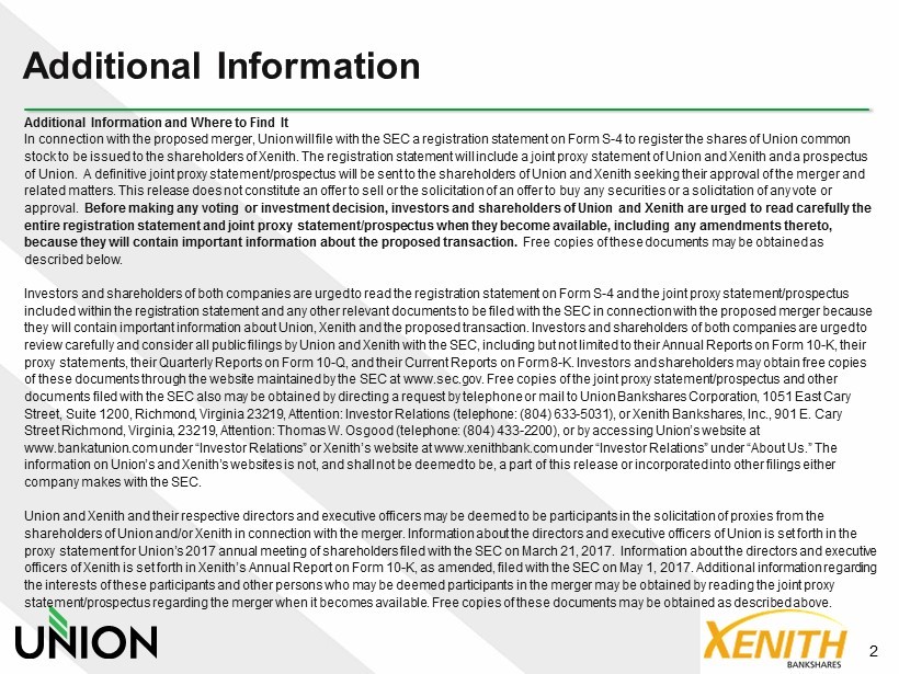 2 Additional Information Additional Information and Where to Find It In connection with the proposed merger, Union will file with the SEC a registration statement on Form S - 4 to register the shares of Union common stock to be issued to the shareholders of Xenith. The registration statement will include a joint proxy statement of Union an d X enith and a prospectus of Union. A definitive joint proxy statement/prospectus will be sent to the shareholders of Union and Xenith seeking their a ppr oval of the merger and related matters. This release does not constitute an offer to sell or the solicitation of an offer to buy any securities or a so licitation of any vote or approval. Before making any voting or investment decision, investors and shareholders of Union and Xenith are urged to read carefully the entire registration statement and joint proxy statement/prospectus when they become available, including any amendments there to, because they will contain important information about the proposed transaction. Free copies of these documents may be obtained as described below. Investors and shareholders of both companies are urged to read the registration statement on Form S - 4 and the joint proxy statem ent/prospectus included within the registration statement and any other relevant documents to be filed with the SEC in connection with the p rop osed merger because they will contain important information about Union, Xenith and the proposed transaction. Investors and shareholders of both com panies are urged to review carefully and consider all public filings by Union and Xenith with the SEC, including but not limited to their Annual Rep orts on Form 10 - K, their proxy statements, their Quarterly Reports on Form 10 - Q, and their Current Reports on Form 8 - K. Investors and shareholders may ob tain free copies of these documents through the website maintained by the SEC at www.sec.gov. Free copies of the joint proxy statement/prospec tus and other documents filed with the SEC also may be obtained by directing a request by telephone or mail to Union Bankshares Corporation , 1 051 East Cary Street, Suite 1200, Richmond, Virginia 23219, Attention: Investor Relations (telephone: (804) 633 - 5031), or Xenith Bankshares, Inc., 901 E. Cary Street Richmond, Virginia, 23219, Attention: Thomas W. Osgood (telephone: (804) 433 - 2200), or by accessing Union’s website at www.banka tunion.com under “Investor Relations” or Xenith’s website at www.xenithbank.com under “Investor Relations” under “About Us.” The informa tio n on Union’s and Xenith’s websites is not, and shall not be deemed to be, a part of this release or incorporated into other filings either com pan y makes with the SEC. Union and Xenith and their respective directors and executive officers may be deemed to be participants in the solicitation o f p roxies from the shareholders of Union and/or Xenith in connection with the merger. Information about the directors and executive officers of Uni on is set forth in the proxy statement for Union’s 2017 annual meeting of shareholders filed with the SEC on March 21, 2017. Information about the dir ectors and executive officers of Xenith is set forth in Xenith’s Annual Report on Form 10 - K, as amended, filed with the SEC on May 1, 2017. Additiona l information regarding the interests of these participants and other persons who may be deemed participants in the merger may be obtained by reading th e joint proxy statement/prospectus regarding the merger when it becomes available. Free copies of these documents may be obtained as descri bed above.