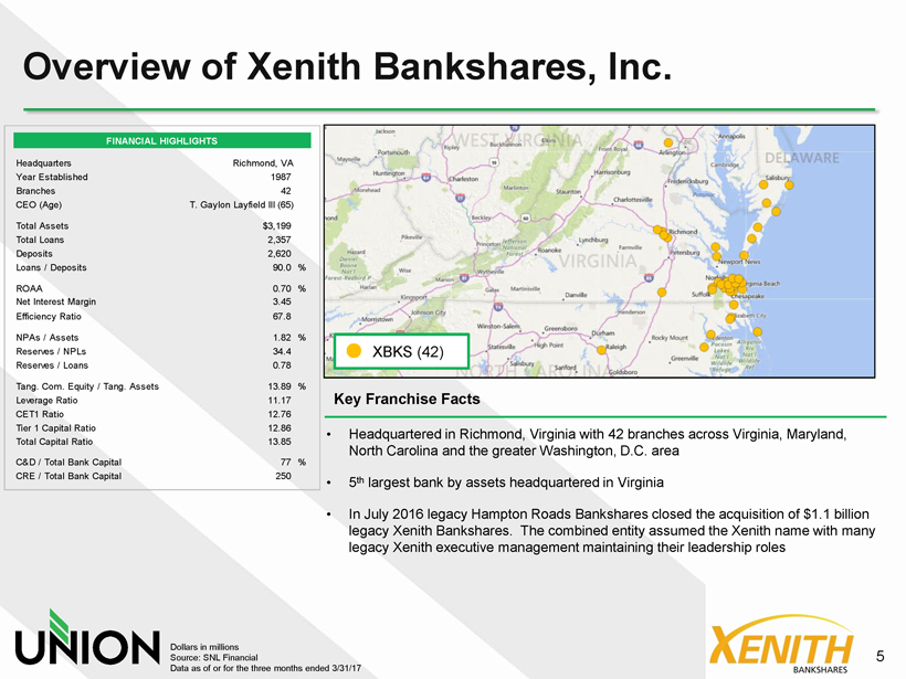 4 Transaction Highlights x Solidifies position as Virginia’s preeminent community bank with ~$ 12 billion in pro forma assets x Provides breadth and depth across Virginia, including significant expansion in the attractive Hampton Roads market x Leverages Xenith’s C&I expertise throughout the combined footprint x Attractive commercial lending expertise x Strong core deposit base x Compatible cultures with similar strategies and community focus x Efficiently crosses $10 billion in assets with positive operating leverage x Immediately accretive to EPS in 2018 x Immediately accretive to tangible book value with no earnback period x Transaction metrics remain attractive under a lower federal corporate tax rate x Comprehensive due diligence and integration planning process x Strong understanding of markets and credit culture x Readiness to cross $10 billion in assets Strategically Compelling Builds Upon Strengths Financially Attractive Low Risk