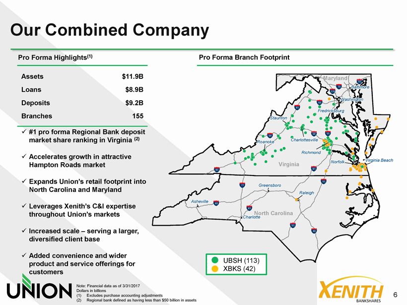 5 Overview of Xenith Bankshares, Inc. Dollars in millions Source: SNL Financial Data as of or for the three months ended 3/31/17 • Headquartered in Richmond, Virginia with 42 branches across Virginia, Maryland, North Carolina and the greater Washington , D.C . area • 5 th largest bank by assets headquartered in Virginia • In July 2016 legacy Hampton Roads Bankshares closed the acquisition of $1.1 billion legacy Xenith Bankshares. The combined entity assumed the Xenith name with many legacy Xenith executive management maintaining their leadership roles Key Franchise Facts XBKS (42) FINANCIAL HIGHLIGHTS Headquarters Richmond, VA Year Established 1987 Branches 42 CEO (Age) T. Gaylon Layfield III (65) Total Assets $3,199 Total Loans 2,357 Deposits 2,620 Loans / Deposits 90.0 % ROAA 0.70 % Net Interest Margin 3.45 Efficiency Ratio 67.8 NPAs / Assets 1.82 % Reserves / NPLs 34.4 Reserves / Loans 0.78 Tang. Com. Equity / Tang. Assets 13.89 % Leverage Ratio 11.17 CET1 Ratio 12.76 Tier 1 Capital Ratio 12.86 Total Capital Ratio 13.85 C&D / Total Bank Capital 77 % CRE / Total Bank Capital 250