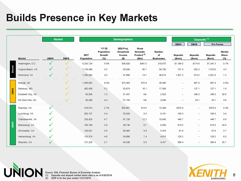 7 Deposits Market Rank Institution ($mm) Share Branches 1 Wells Fargo & Co. $38,613 20.32% 284 2 Bank of America Corp. 26,154 13.76 130 3 BB&T Corp. 22,631 11.91 344 4 SunTrust Banks Inc. 19,015 10.01 193 5 Capital One Financial Corp. 14,812 7.79 59 Pro Forma 8,105 4.26 143 6 United Bankshares Inc. 7,090 3.73 73 7 Union Bankshares Corp. 6,102 3.21 113 8 TowneBank 5,704 3.00 32 9 Carter Bank & Trust 3,948 2.08 88 10 PNC Financial Services Group Inc. 3,479 1.83 96 13 Xenith Bankshares Inc. 2,003 1.05 30 Enhanced Presence in Key Markets Source: SNL Financial Deposit data as of 6/30/16; pro forma for announced transactions Virginia Beach - Norfolk - Newport News, VA - NC MSA Deposits Market Rank Institution ($mm) Share Branches 1 TowneBank $5,133 21.51% 26 2 Wells Fargo & Co. 4,713 19.75 52 3 SunTrust Banks Inc. 3,887 16.29 36 4 BB&T Corp. 3,120 13.07 47 5 Bank of America Corp. 2,855 11.96 32 Pro Forma 1,080 4.52 26 6 Xenith Bankshares Inc. 922 3.86 21 7 Old Point Financial Corp. 729 3.06 20 8 Southern BancShares (N.C.) Inc. 459 1.92 11 9 PNC Financial Services Group Inc. 389 1.63 11 10 Chesapeake Financial Shares Inc. 331 1.39 8 14 Union Bankshares Corp. 157 0.66 5 Deposits Market Rank Institution ($mm) Share Branches 1 Bank of America Corp. $12,320 35.60% 23 2 Wells Fargo & Co. 6,754 19.52 62 3 SunTrust Banks Inc. 4,434 12.81 39 4 BB&T Corp. 3,200 9.25 40 Pro Forma 2,502 7.23 36 5 Union Bankshares Corp. 1,827 5.28 32 6 C&F Financial Corp. 776 2.24 17 7 TowneBank 735 2.12 9 8 Xenith Bankshares Inc. 675 1.95 4 9 South State Corp. 542 1.57 8 10 Community Bankers Trust Corp. 519 1.50 10 Richmond, VA MSA Virginia