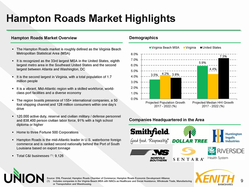 8 Market Demographics Deposits (1) UBSH XBKS Pro Forma '17-'22 2022 Proj. Gross Population Household Domestic Number Market 2017 Growth Income Product (2) of Deposits Deposits Deposits Share Market UBSH XBKS Population (%) ($) ($bn) Businesses ($mm) ($mm) ($mm) (%) Washington, D.C. 6,203,724 5.5% $95,629 $491.0 219,675 $1,166.5 $174.8 $1,341.3 0.7% Virginia Beach, VA 1,743,468 3.5 63,930 95.7 58,790 157.4 922.2 1,079.6 4.5 Richmond, VA 1,285,883 4.6 67,686 74.1 46,613 1,827.3 674.5 2,501.8 7.2 Raleigh, NC 1,305,052 8.2% $70,453 $75.8 45,485 -- $67.9 $67.9 0.3% Salisbury, MD 402,439 5.2 63,679 16.1 17,569 -- 127.1 127.1 1.8 Elizabeth City, NC 63,536 1.3 51,437 NA 2,523 -- 248.3 248.3 30.6 Kill Devil Hills, NC 40,288 4.4 61,158 NA 3,648 -- 54.1 54.1 4.8 Roanoke, VA 316,013 2.7% $55,867 $14.5 13,288 $378.4 -- $378.4 5.2% Lynchburg, VA 262,137 3.4 53,020 9.3 9,151 180.3 -- 180.3 3.8 Charlottesville, VA 233,423 4.7 67,126 12.2 10,643 446.7 -- 446.7 9.9 Blacksburg, VA 183,199 2.9 48,740 6.7 6,059 614.5 -- 614.5 20.6 Winchester, VA 135,021 3.8 58,405 5.9 5,416 91.8 -- 91.8 3.7 Harrisonburg, VA 133,374 4.6 54,686 7.4 4,615 128.2 -- 128.2 6.0 Staunton, VA 121,226 2.7 54,245 5.0 4,417 368.4 -- 368.4 25.1 UBSH XBKS Shared Builds Presence in Key Markets Source: SNL Financial; Bureau of Economic Analysis (1) Deposits and deposit market share data is as of 6/30/2016 (2) GDP is for the year ended 12/31/2015