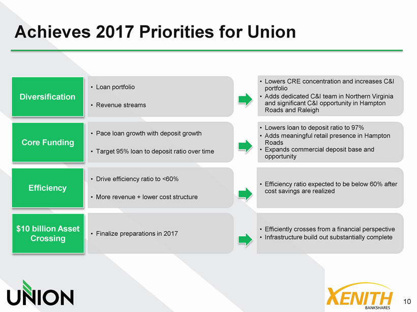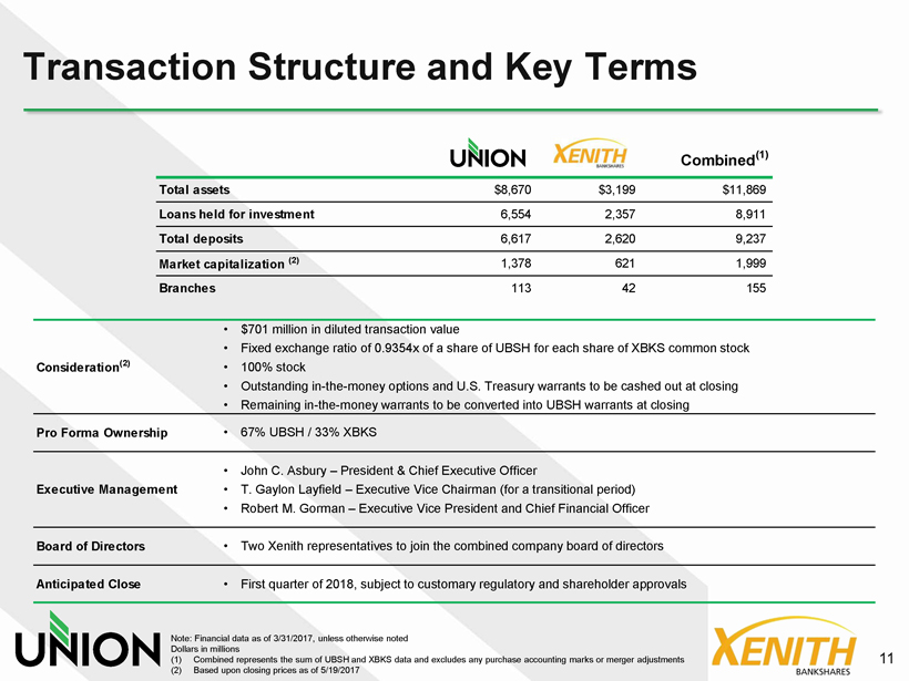 10 Achieves 2017 Priorities for Union • Lowers CRE concentration and increases C&I portfolio • Adds dedicated C&I team in Northern Virginia and significant C&I opportunity in Hampton Roads and Raleigh • Lowers loan to deposit ratio to 97% • Adds meaningful retail presence in Hampton Roads • Expands commercial deposit base and opportunity • Efficiency ratio expected to be below 60% after cost savings are realized • Efficiently crosses from a financial perspective • Infrastructure build out substantially complete Diversification Core Funding Efficiency $10 billion Asset Crossing • Loan portfolio • Revenue streams • Pace loan growth with deposit growth • Target 95% loan to deposit ratio over time • Drive efficiency ratio to <60 % • More revenue + lower cost structure • Finalize preparations in 2017