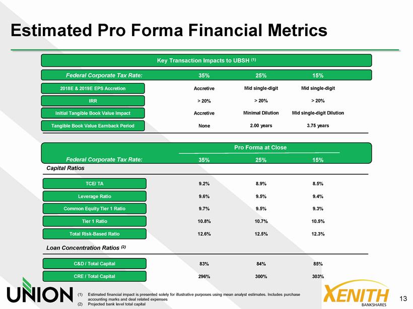 12 Key Assumptions Cost Savings Credit Mark ▪ Gross loan credit mark of approximately 1.5%, or $37 million ▪ Expected to be approximately $28 million pre - tax (fully phased - in) − ~40 % of XBKS ’ 2018 estimated noninterest expense − 80% realized in 2018, 100% annually thereafter Merger & Integration Costs ▪ Expected to be approximately $33 million after - tax $10 Billion Crossing Impact ▪ Pre - tax impact ~$11 million annualized, beginning third quarter 2019 Other Adjustments ▪ Core deposit intangible of 1.50% ($26 million) assumed on non - time deposits, amortized sum - of - years’ - digits over 10 years ▪ Borrowings write - up of $9 million Deferred Tax Asset ▪ No write - down of deferred tax asset required under current federal corporate tax rate of 35% ▪ Under a 25% federal corporate tax rate the deferred tax asset would be written down by ~$42 million Revenue Enhancements ▪ Identified revenue opportunities, but none assumed in financial model F ederal Corporate Tax Rate ▪ 3 5%