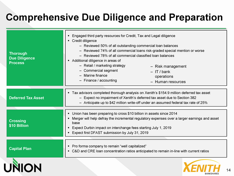 13 Estimated Pro Forma Financial Metrics (1) Estimated financial impact is presented solely for illustrative purposes using mean analyst estimates. Includes purchase accounting marks and deal related expenses (2) Projected bank level total capital Key Transaction Impacts to UBSH (1) 2018E & 2019E EPS Accretion IRR Initial Tangible Book Value Impact Tangible Book Value Earnback Period Capital Ratios TCE/ TA Leverage Ratio Common Equity Tier 1 Ratio Tier 1 Ratio Total Risk - Based Ratio Loan Concentration Ratios (2) C&D / Total Capital CRE / Total Capital Accretive > 20% Accretive None 9.2% 9.6% 9.7% 10.8% 12.6% 8 .9% 9.5% 9.5% 10.7% 12.5% 8.5% 9.4% 9.3% 10.5% 12.3% 83% 296% 84% 300% 85% 303% Pro Forma at Close 35% Federal Corporate Tax Rate: 25% 1 5% Mid single - digit > 20% Minimal Dilution 2.00 years Mid single - digit > 20% Mid single - digit Dilution 3.75 years 35% Federal Corporate Tax Rate: 25% 1 5%