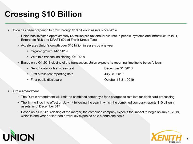 14 Comprehensive Due Diligence and Preparation Deferred Tax Asset ▪ Tax advisors completed thorough analysis on Xenith’s $154.9 million deferred tax asset ‒ Expect no impairment of Xenith’s deferred tax asset due to Section 382 ‒ Anticipate up to $42 million write - off under an assumed federal tax rate of 25% Thorough Due Diligence Process ▪ Engaged third party resources for Credit, Tax and Legal diligence ▪ Credit diligence ‒ Reviewed 50% of all outstanding commercial loan balances ‒ Reviewed 74% of all commercial loans risk - graded special mention or worse ‒ Reviewed 78% of all commercial classified loan balances ▪ Additional diligence in areas of ‒ Retail / marketing strategy ‒ Commercial segment ‒ Marine finance ‒ Finance / accounting Crossing $10 Billion ▪ Union has been preparing to cross $10 billion in assets since 2014 ▪ Merger will help defray the incremental regulatory expenses over a larger earnings and asset base ▪ Expect Durbin impact on interchange fees starting July 1, 2019 ▪ Expect first DFAST submission by July 31, 2019 ‒ Risk management ‒ IT / bank operations ‒ Human resources Capital Plan ▪ Pro forma company to remain “well capitalized” ▪ C&D and CRE loan concentration ratios anticipated to remain in - line with current ratios