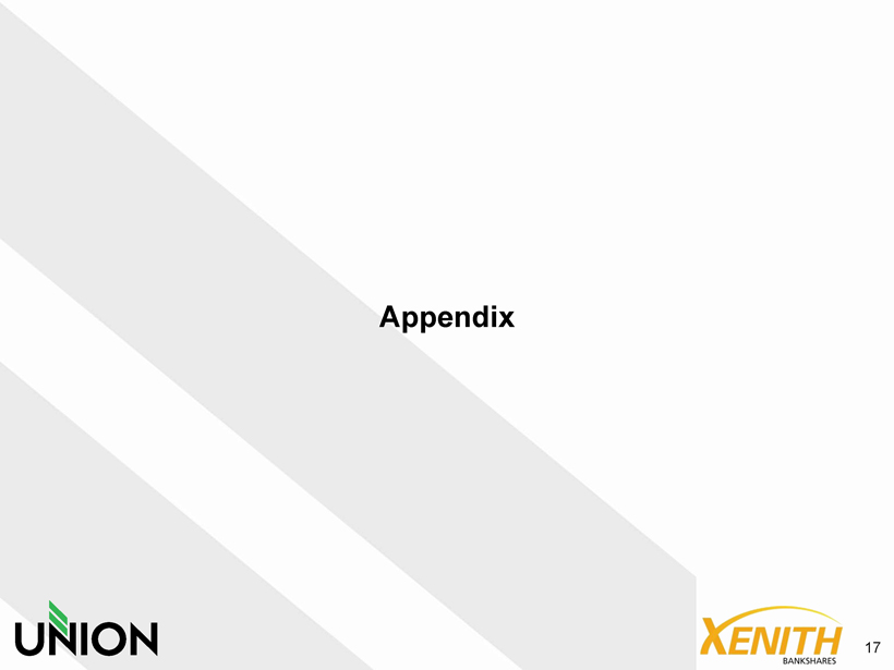 15 Crossing $10 Billion ▪ Union has been preparing to grow through $10 billion in assets since 2014 − Union has invested approximately $5 million pre - tax annual run rate in people, systems and infrastructure in IT, Enterprise Risk and DFAST (Dodd Frank Stress Test) − Accelerates Union’s growth over $10 billion in assets by one year ▪ Organic growth: Mid 2019 ▪ With this transaction closing: Q1 2018 − Based on a Q1 2018 closing of the transaction, Union expects its reporting timeline to be as follows: ▪ “As - of” date for first stress test December 31, 2018 ▪ First stress test reporting date July 31, 2019 ▪ First public disclosure October 15 - 31, 2019 ▪ Durbin amendment − The Durbin amendment will limit the combined company’s fees charged to retailers for debit card processing − The limit will go into effect on July 1 st following the year in which the combined company reports $10 billion in assets as of December 31 st − Based on a Q1 2018 closing of the merger, the combined company expects the impact to begin on July 1, 2019, which is one year earlier than previously expected on a standalone basis