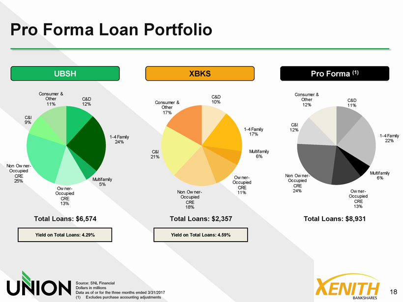 18 Pro Forma Loan Portfolio Source: SNL Financial Dollars in millions Data as of or for the three months ended 3/31/2017 (1) Excludes purchase accounting adjustments UBSH XBKS Pro Forma (1) C&D 12% 1 - 4 Family 24% Multifamily 5% Owner - Occupied CRE 13% Non Owner - Occupied CRE 25% C&I 9% Consumer & Other 11% C&D 10% 1 - 4 Family 17% Multifamily 6% Owner - Occupied CRE 11% Non Owner - Occupied CRE 18% C&I 21% Consumer & Other 17% C&D 11% 1 - 4 Family 22% Multifamily 6% Owner - Occupied CRE 13% Non Owner - Occupied CRE 24% C&I 12% Consumer & Other 12% Yield on Total Loans: 4.29% Yield on Total Loans : 4.59% Total Loans: $6,574 Total Loans: $2,357 Total Loans: $8,931