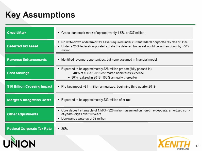 11 Consideration (2) Pro Forma Ownership Executive Management Board of Directors Anticipated Close Transaction Structure and Key Terms Note: Financial data as of 3/31/2017, unless otherwise noted Dollars in millions (1) Combined represents the sum of UBSH and XBKS data and excludes any purchase accounting marks or merger adjustments (2) Based upon closing prices as of 5/19/2017 Combined (1) Total assets $8,670 $3,199 $11,869 Loans held for investment 6,554 2,357 8,911 Total deposits 6,617 2,620 9,237 Market capitalization (2) 1,378 621 1,999 Branches 113 42 155 • $701 million in diluted transaction value • Fixed exchange ratio of 0.9354x of a share of UBSH for each share of XBKS common stock • 100% stock • Outstanding in - the - money options and U.S. Treasury warrants to be cashed out at closing • Remaining in - the - money warrants to be converted into UBSH warrants at closing • 67% UBSH / 33% XBKS • John C. Asbury – President & Chief Executive Officer • T. Gaylon Layfield – Executive Vice Chairman (for a transitional period) • Robert M. Gorman – Executive Vice President and Chief Financial Officer • Two Xenith representatives to join the combined company board of directors • First quarter of 2018, subject to customary regulatory and shareholder approvals
