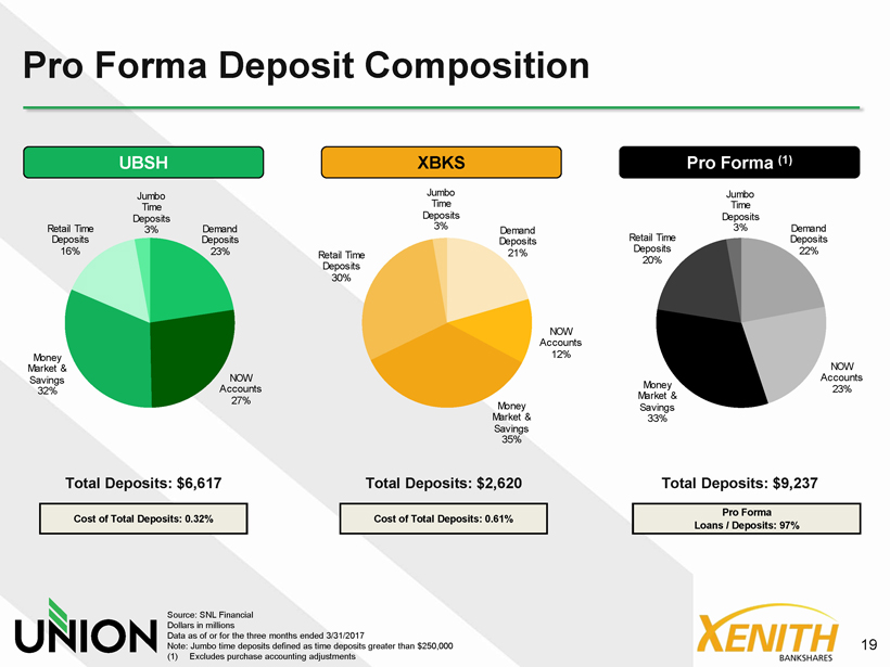18 Pro Forma Loan Portfolio Source: SNL Financial Dollars in millions Data as of or for the three months ended 3/31/2017 (1) Excludes purchase accounting adjustments UBSH XBKS Pro Forma (1) C&D 12% 1 - 4 Family 24% Multifamily 5% Owner - Occupied CRE 13% Non Owner - Occupied CRE 25% C&I 9% Consumer & Other 11% C&D 10% 1 - 4 Family 17% Multifamily 6% Owner - Occupied CRE 11% Non Owner - Occupied CRE 18% C&I 21% Consumer & Other 17% C&D 11% 1 - 4 Family 22% Multifamily 6% Owner - Occupied CRE 13% Non Owner - Occupied CRE 24% C&I 12% Consumer & Other 12% Yield on Total Loans: 4.29% Yield on Total Loans : 4.59% Total Loans: $6,574 Total Loans: $2,357 Total Loans: $8,931