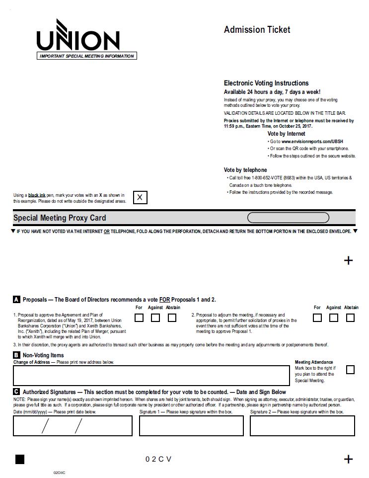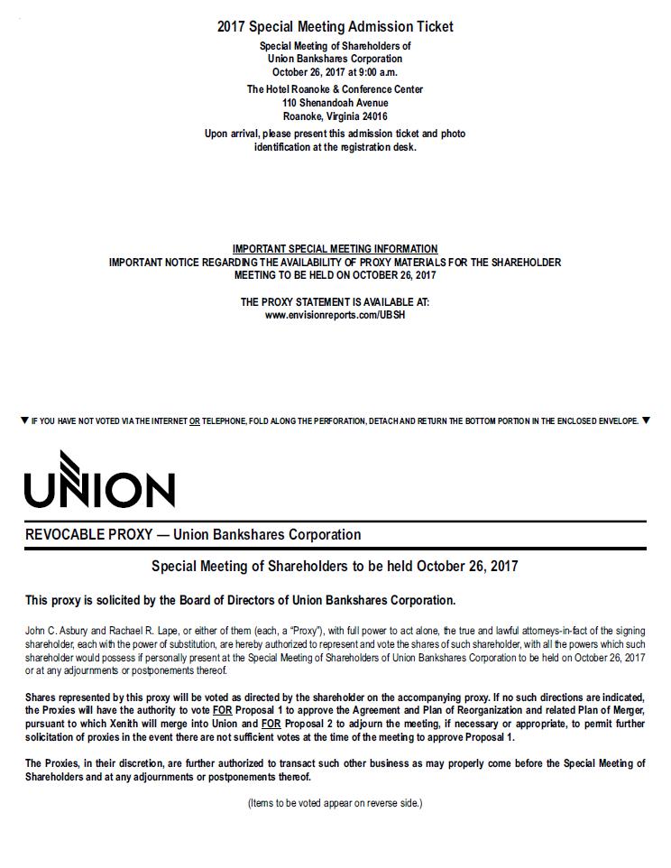 . Special Meeting of Shareholders to be held October 26, 2017 This proxy is solicited by the Board of Directors of Union Bankshares Corporation. John C. Asbury and Rachael R. Lape, or either of them (each, a “Proxy”), with full power to act alone, the true and lawful attorneys-in-fact of the signing shareholder, each with the power of substitution, are hereby authorized to represent and vote the shares of such shareholder, with all the powers which such shareholder would possess if personally present at the Special Meeting of Shareholders of Union Bankshares Corporation to be held on October 26, 2017 or at any adjournments or postponements thereof. Shares represented by this proxy will be voted as directed by the shareholder on the accompanying proxy. If no such directions are indicated, the Proxies will have the authority to vote FOR Proposal 1 to approve the Agreement and Plan of Reorganization and related Plan of Merger, pursuant to which Xenith will merge into Union and FOR Proposal 2 to adjourn the meeting, if necessary or appropriate, to permit further solicitation of proxies in the event there are not sufficient votes at the time of the meeting to approve Proposal 1. The Proxies, in their discretion, are further authorized to transact such other business as may properly come before the Special Meeting of Shareholders and at any adjournments or postponements thereof. (Items to be voted appear on reverse side.) REVOCABLE PROXY — Union Bankshares Corporation IMPORTANT SPECIAL MEETING INFORMATION IMPORTANT NOTICE REGARDING THE AVAILABILITY OF PROXY MATERIALS FOR THE SHAREHOLDER MEETING TO BE HELD ON OCTOBER 26, 2017 THE PROXY STATEMENT IS AVAILABLE AT: www.envisionreports.com/UBSH 2017 Special Meeting Admission Ticket Special Meeting of Shareholders of Union Bankshares Corporation October 26, 2017 at 9:00 a.m. The Hotel Roanoke & Conference Center 110 Shenandoah Avenue Roanoke, Virginia 24016 Upon arrival, please present this admission ticket and photo identification at the registration desk. qIF YOU HAVE NOT VOTED VIA THE INTERNET OR TELEPHONE, FOLD ALONG THE PERFORATION, DETACH AND RETURN THE BOTTOM PORTION IN THE ENCLOSED ENVELOPE.q