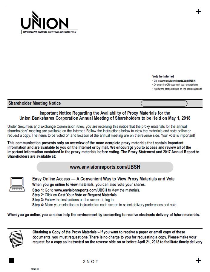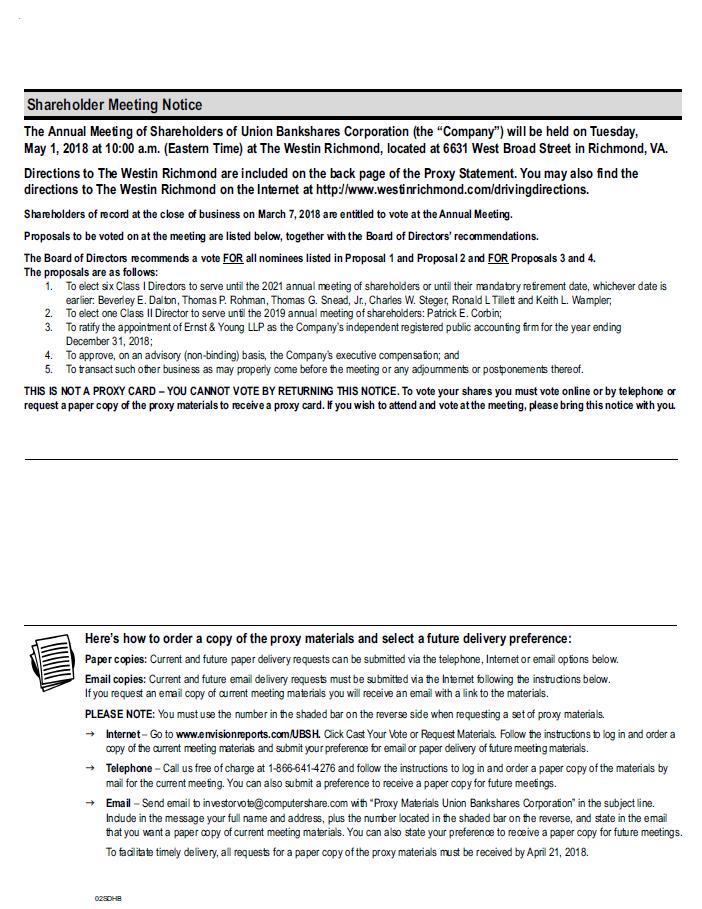 Here‘s how to order a copy of the proxy materials and select a future delivery preference: Paper copies: Current and future paper delivery requests can be submitted via the telephone, Internet or email options below. Email copies: Current and future email delivery requests must be submitted via the Internet following the instructions below. If you request an email copy of current meeting materials you will receive an email with a link to the materials. PLEASE NOTE: You must use the number in the shaded bar on the reverse side when requesting a set of proxy materials. g Internet - Go to www.envisionreports.com/UBSH. Click Cast Your Vote or Request Materials. Follow the instructions to log in and order a copy of the current meeting materials and submit your preference for email or paper delivery of future meeting materials. g Telephone - Call us free of charge at 1-866-641-4276 and follow the instructions to log in and order a paper copy of the materials by mail for the current meeting. You can also submit a preference to receive a paper copy for future meetings. g Email - Send email to investorvote@computershare.com with “Proxy Materials Union Bankshares Corporation” in the subject line. Include in the message your full name and address, plus the number located in the shaded bar on the reverse, and state in the email that you want a paper copy of current meeting materials. You can also state your preference to receive a paper copy for future meetings. To facilitate timely delivery, all requests for a paper copy of the proxy materials must be received by April 21, 2018. .. Shareholder Meeting Notice The Annual Meeting of Shareholders of Union Bankshares Corporation (the “Company”) will be held on Tuesday, May 1, 2018 at 10:00 a.m. (Eastern Time) at The Westin Richmond, located at 6631 West Broad Street in Richmond, VA. Directions to The Westin Richmond are included on the back page of the Proxy Statement. You may also find the directions to The Westin Richmond on the Internet at http://www.westinrichmond.com/drivingdirections. Shareholders of record at the close of business on March 7, 2018 are entitled to vote at the Annual Meeting. Proposals to be voted on at the meeting are listed below, together with the Board of Directors‘ recommendations. The Board of Directors recommends a vote FOR all nominees listed in Proposal 1 and Proposal 2 and FOR Proposals 3 and 4. The proposals are as follows: 1. To elect six Class I Directors to serve until the 2021 annual meeting of shareholders or until their mandatory retirement date, whichever date is earlier: Beverley E. Dalton, Thomas P. Rohman, Thomas G. Snead, Jr., Charles W. Steger, Ronald L Tillett and Keith L. Wampler; 2. To elect one Class II Director to serve until the 2019 annual meeting of shareholders: Patrick E. Corbin; 3. To ratify the appointment of Ernst & Young LLP as the Company‘s independent registered public accounting firm for the year ending December 31, 2018; 4. To approve, on an advisory (non-binding) basis, the Company‘s executive compensation; and 5. To transact such other business as may properly come before the meeting or any adjournments or postponements thereof. THIS IS NOT A PROXY CARD - YOU CANNOT VOTE BY RETURNING THIS NOTICE. To vote your shares you must vote online or by telephone or request a paper copy of the proxy materials to receive a proxy card. If you wish to attend and vote at the meeting, please bring this notice with you. 02SDHB