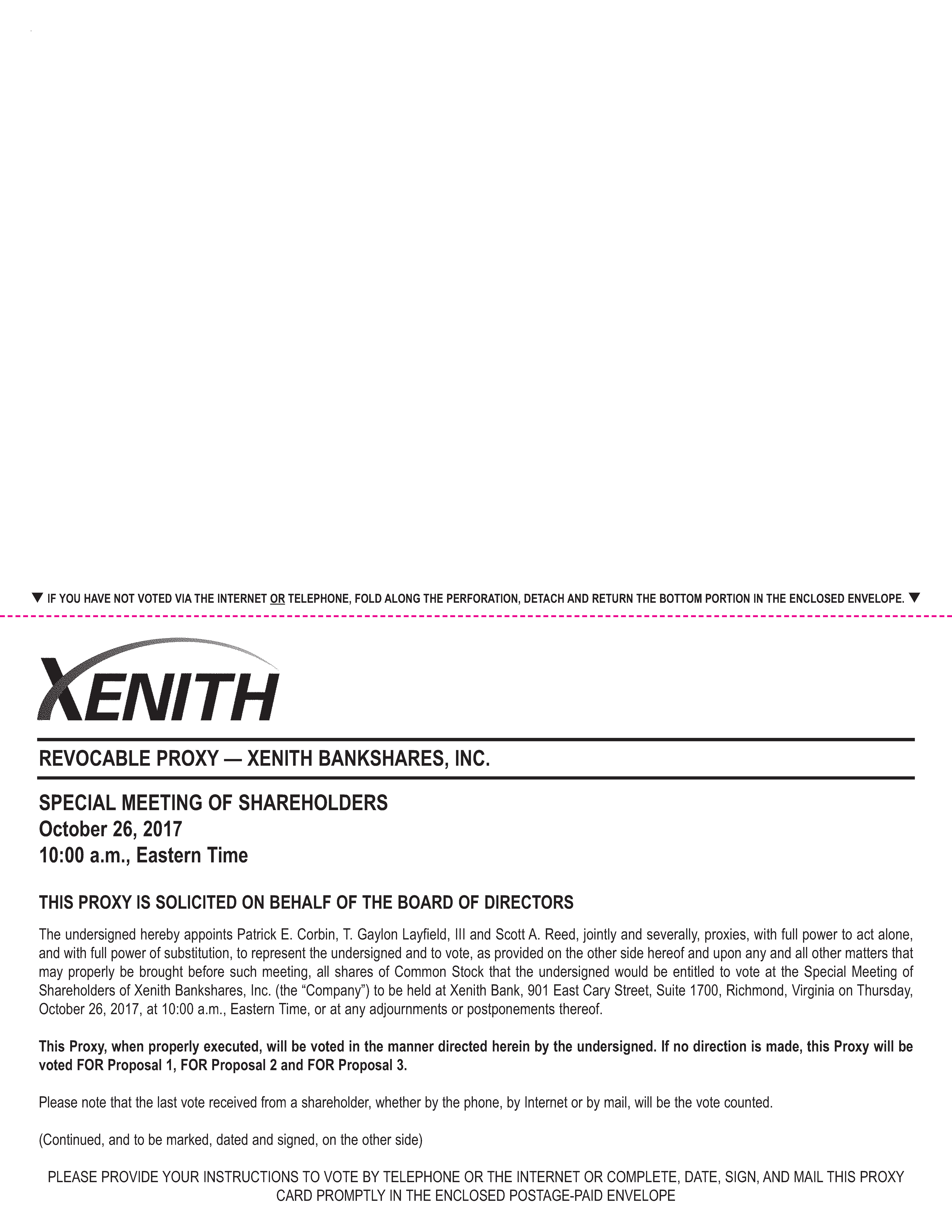 . SPECIAL MEETING OF SHAREHOLDERS October 26, 2017 10:00 a.m., Eastern Time THIS PROXY IS SOLICITED ON BEHALF OF THE BOARD OF DIRECTORS The undersigned hereby appoints Patrick E. Corbin, T. Gaylon Layfield, III and Scott A. Reed, jointly and severally, proxies, with full power to act alone, and with full power of substitution, to represent the undersigned and to vote, as provided on the other side hereof and upon any and all other matters that may properly be brought before such meeting, all shares of Common Stock that the undersigned would be entitled to vote at the Special Meeting of Shareholders of Xenith Bankshares, Inc. (the “Company”) to be held at Xenith Bank, 901 East Cary Street, Suite 1700, Richmond, Virginia on Thursday, October 26, 2017, at 10:00 a.m., Eastern Time, or at any adjournments or postponements thereof. This Proxy, when properly executed, will be voted in the manner directed herein by the undersigned. If no direction is made, this Proxy will be voted FOR Proposal 1, FOR Proposal 2 and FOR Proposal 3. Please note that the last vote received from a shareholder, whether by the phone, by Internet or by mail, will be the vote counted. (Continued, and to be marked, dated and signed, on the other side) PLEASE PROVIDE YOUR INSTRUCTIONS TO VOTE BY TELEPHONE OR THE INTERNET OR COMPLETE, DATE, SIGN, AND MAIL THIS PROXY CARD PROMPTLY IN THE ENCLOSED POSTAGE-PAID ENVELOPE REVOCABLE PROXY — XENITH BANKSHARES, INC. qIF YOU HAVE NOT VOTED VIA THE INTERNET OR TELEPHONE, FOLD ALONG THE PERFORATION, DETACH AND RETURN THE BOTTOM PORTION IN THE ENCLOSED ENVELOPE.q